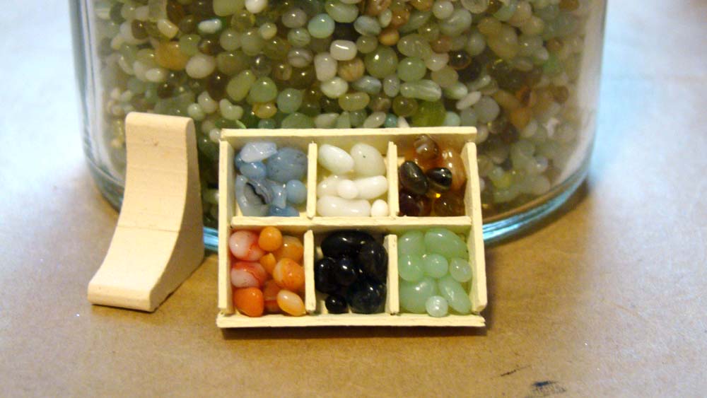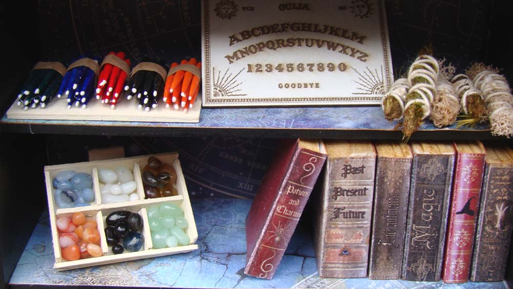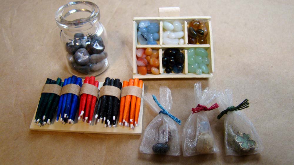The storage case for her various magical fairy dusts, charms and enchantments was made from the base of a Suitcase-1 5/8 Inch that was covered in pretty floral paper and wrapped with a scrap of lace. I used some small bottles I had in my stash as well as some Tiny Glass Bottles filled with glitter and sparkly nail art decorations. The tops were decorated with Red Mushroom and Bright Flowers polymer clay slices. I just love working with poly clay canes and slices, they’re so versatile in miniature crafting!