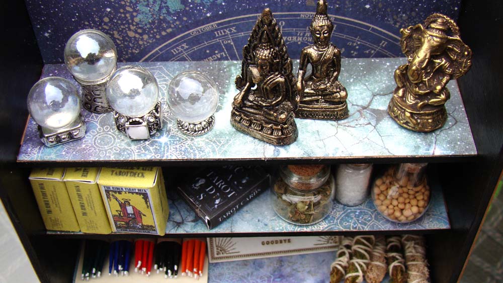 This fairy godmother is very tuned into nature, which you can tell from her assortment of flowery crowns tucked inside a White Wall Shelf with Hooks. She also stores her extra sets of wings here, which are cut from a Just Wings Collage Sheet transparency and accessorized with Tiny Hollow Silver Star Charms (she’s very fashionable). Also hanging here are a Set of 3 Tiny Keys on a Ring which I am certain open magical doors.