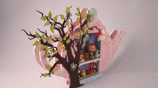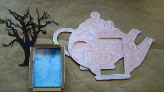 The tree that holds the Cheshire Cat cut from the Tin Sized Alice collage sheet is a 5 inch Creepy Tree with just a little branch cut away to assure the niche opening isn’t completely covered. I painted both sides of the tree with burnt umber acrylic paint.