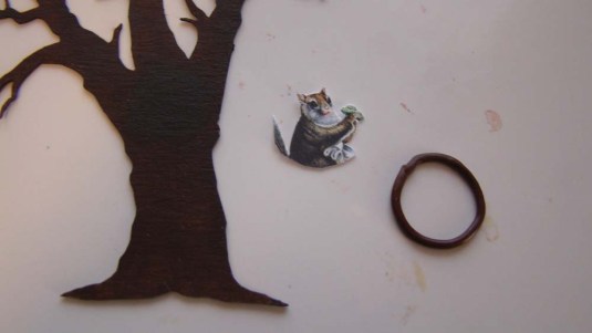 I knew I wanted a squirrel to overlook the tea party. I grabbed one from the Into the Woods collage sheet and shrunk it down a little bit. I baked off a little circle of brown polymer clay to simulate a knot hole.
