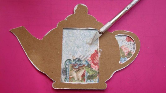 The paper I used to cover the teapot is Heartland’s Kiss Kiss. It’s a soft pink on one side and has bits of soft blue on the opposite side. I was able to get all of the paper needed for this project from a single 12×12 sheet. I used the teapot shape to trace around the exterior of the pots then glued it in place. Once the glue dried, I cut out the handle and niche spaces with an X-Acto knife.