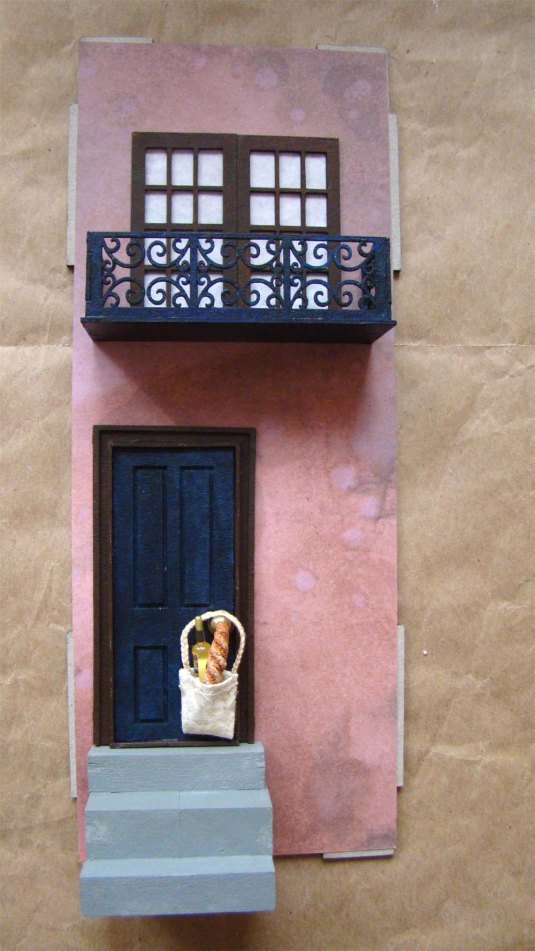 Here’s something brand new… a book nook! These little things are getting popular for adding miniature magic to bookshelves. They measure roughly the height and width of one or two books and are decorated as slender dioramas. When sandwiched between two books on a bookshelf, it appears your shelf is a passageway to someplace either real or imagined. Thanks to our recent travel, I was inspired to make a European alleyway. I was enchanted by the colorful homes we came across in Italy, France, Spain and Portugal.